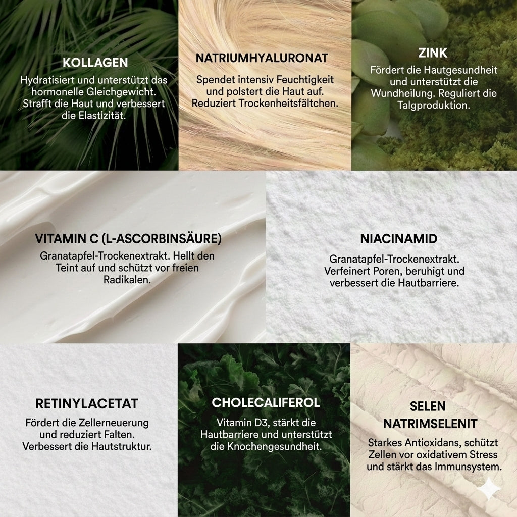 Kollagenhydrolysat (65,22%), Überzugsmittel: Hydroxypropylmethylcellulose, Natriumhyaluronat (8,05%), L-Ascorbinsäure (2,03%), Zinkbisglycinat (1,55%), Granatapfelfrucht-Trockenextrakt (1,45%), Trennmittel: L- Leucin, Nicotinamid (1,39%),Reisstärke, Retinylacetat (0,47%), Cholecalciferol (0,17%), Natriumselenit (0,01%)