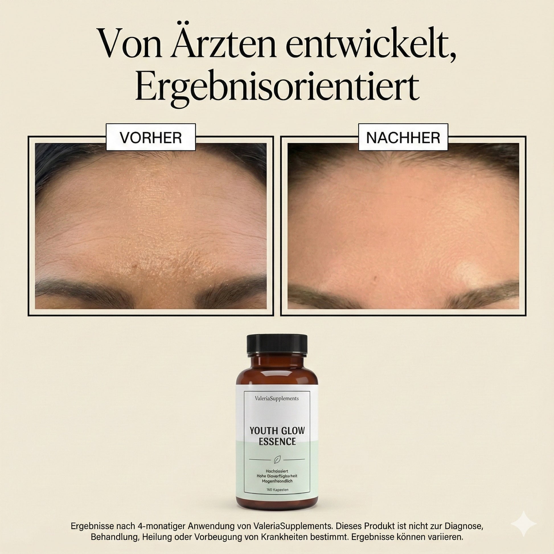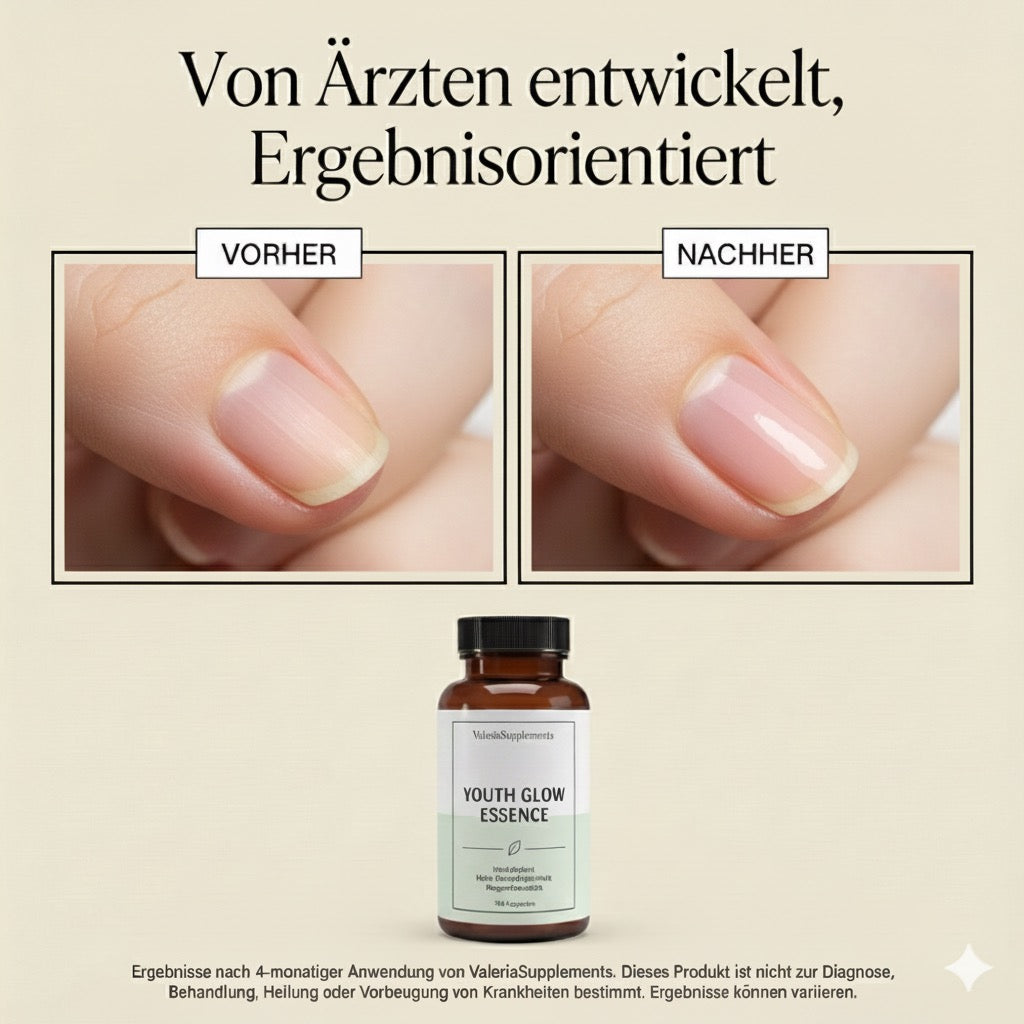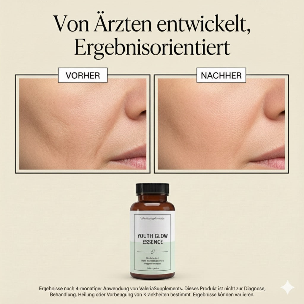 Nimm täglich 2 Kapseln und lass die Magie beginnen! Kontinuität ist der Schlüssel – dein Körper absorbiert jetzt 65% reines Kollagen und 8% Hyaluronsäure. Die Youth Glow Essence startet ihre Arbeit auf Zellebene. Sichtbare Ergebnisse zeigen sich typischerweise innerhalb von 90 Tagen.